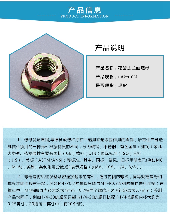 花齒防松螺母的原理:在組裝時,內齒的側面彼此相對,而壓花的外表面的接觸面則咬入兩端。表面之間的相對運動產生提升張力,實現鎖定效果。