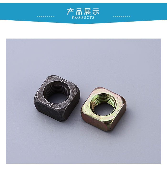 方形螺母表面處理采用:電鍍白鋅,藍(lán)白鋅,五彩鋅,發(fā)黑,本色五種表面處理方式可選。